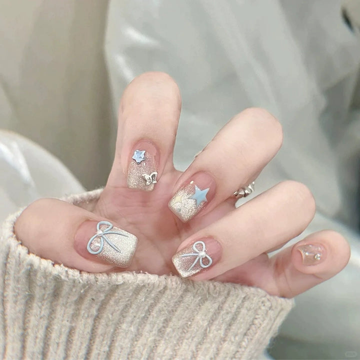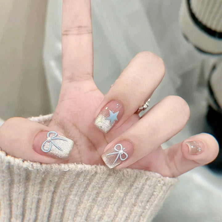 Mint milk blue gradual change nail art pure handmade wear nail short cute white