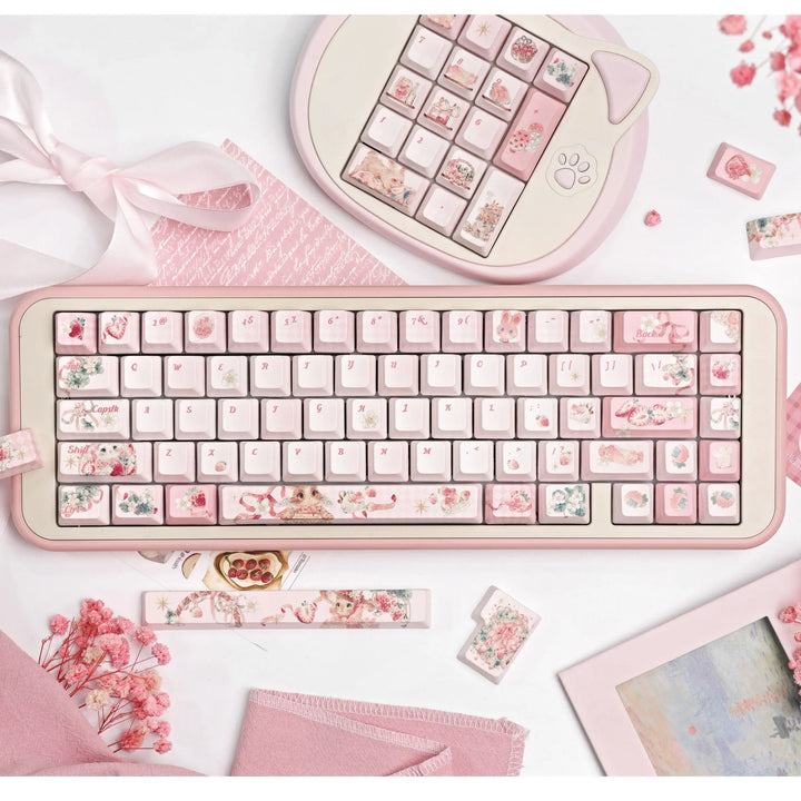 Transform your keyboard into a kawaii wonderland! These keycaps combine playful rabbit characters with sweet strawberry and lily motifs, creating a cheerful atmosphere that makes typing fun.